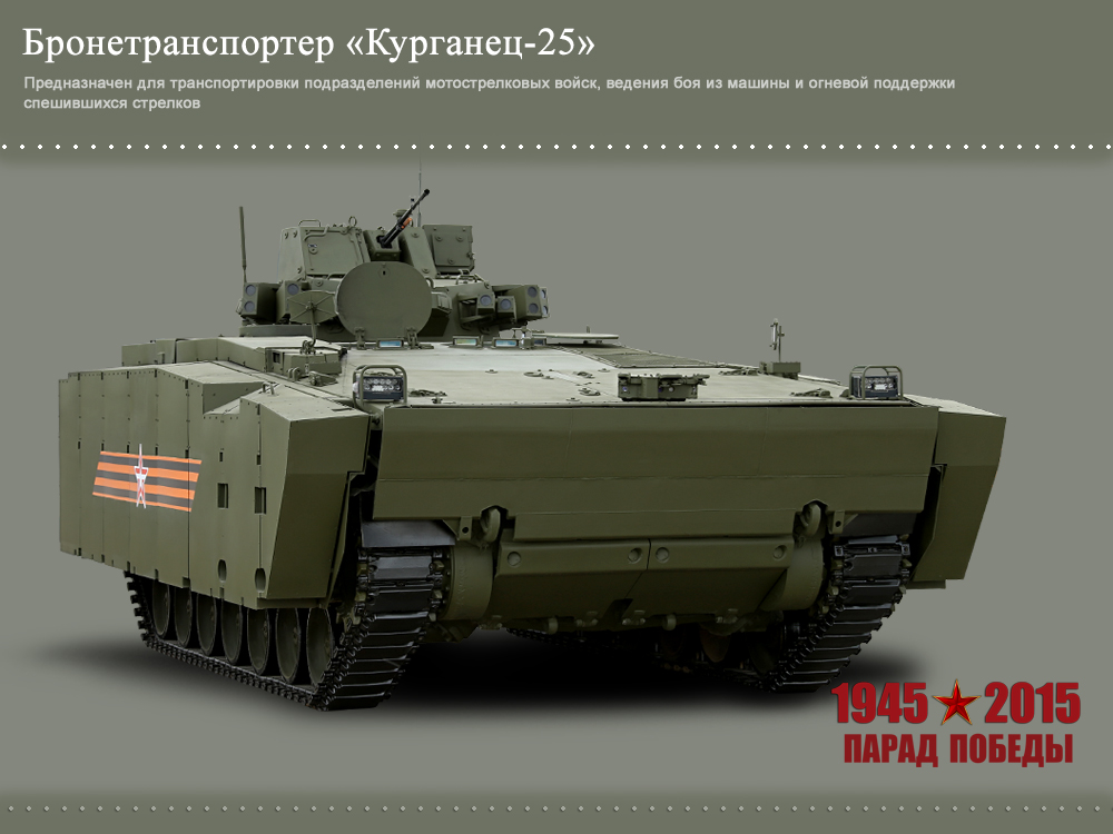 На сайте военного ведомства впервые можно увидеть фотографии среднего танка \»Армата\», боевой машины пехоты \»Армата\», самоходной артиллерийской установки \»Коалиция-СВ\», подвижного противотанкового ракетного комплекса \»Корнет-Д\», боевой машины пехоты \»Курганец-25\» и бронетранспортера \»Курганец-25\».